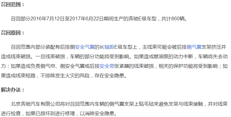 以上是2018年5月25日,北京奔馳汽車公司有限公司,因汽車主線束破損而召回汽車的一系列新聞。其中原因是”汽車線束破損,車輛的部分功能受到影響。如果造成燃油泵的動力中斷,車輛將失去動力;如果造成負責側氣簾、側安全氣囊或后排安全帶張緊器的線束破損,相關的保護功能將受到影響;如果造成線束短路,不排除發(fā)生火災的風險,存在安全隱患”。因此,我們應該注意預防和防范。